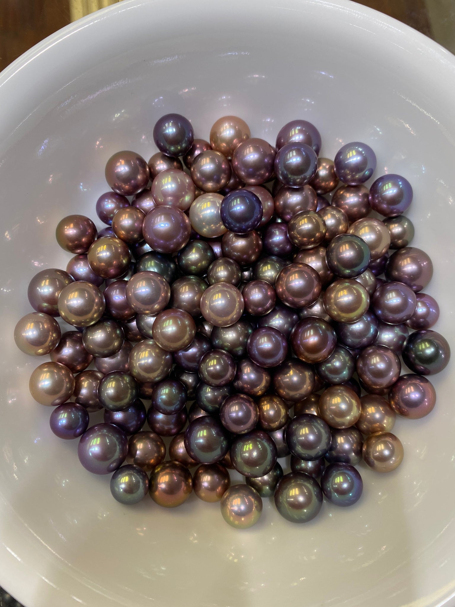 None of these pearls have been treated. We buy directly from pearl farmers and auctions in Tahiti and Burma more than five times a year to give our clients the best selection possible. We carry Golden South Sea pearls and White south sea pearls as well. We carry all shapes and qualities of Tahitian Pearls from Circles, to Semi Baroque to Near Round and Round shapes. We also carry hard to find large sizes such as 15mm, 16mm and even 17mm plus Tahitian pearls in a variety of shapes and qualities.